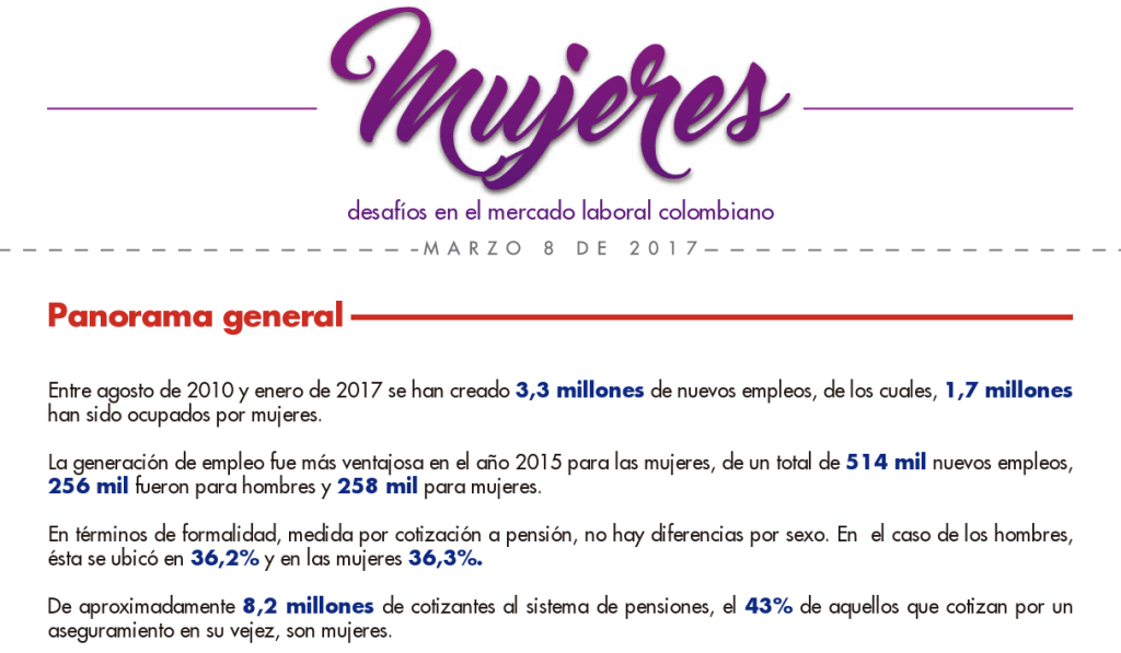 En Colombia, el mercado laboral sigue mostrando avances y desafíos para las mujeres. A pesar de los significativos logros en la generación de empleo en los últimos años, las mujeres siguen enfrentando obstáculos en términos de acceso, formalización y permanencia en el mercado laboral. Entre 2010 y 2017 se han generado 3,3 millones de nuevos empleos, de los cuales 1,7 millones han sido ocupados por mujeres. A pesar de la creciente participación femenina, las brechas de género continúan siendo evidentes, especialmente en la tasa de desempleo y en la duración del tiempo que las mujeres pasan sin empleo. En este contexto, el Servicio Público de Empleo (SPE) ha jugado un papel crucial en la inclusión laboral de las mujeres, con estrategias específicas de inclusión laboral con equidad de género y el fortalecimiento de capacidades para mejorar la inserción laboral para las mujeres.